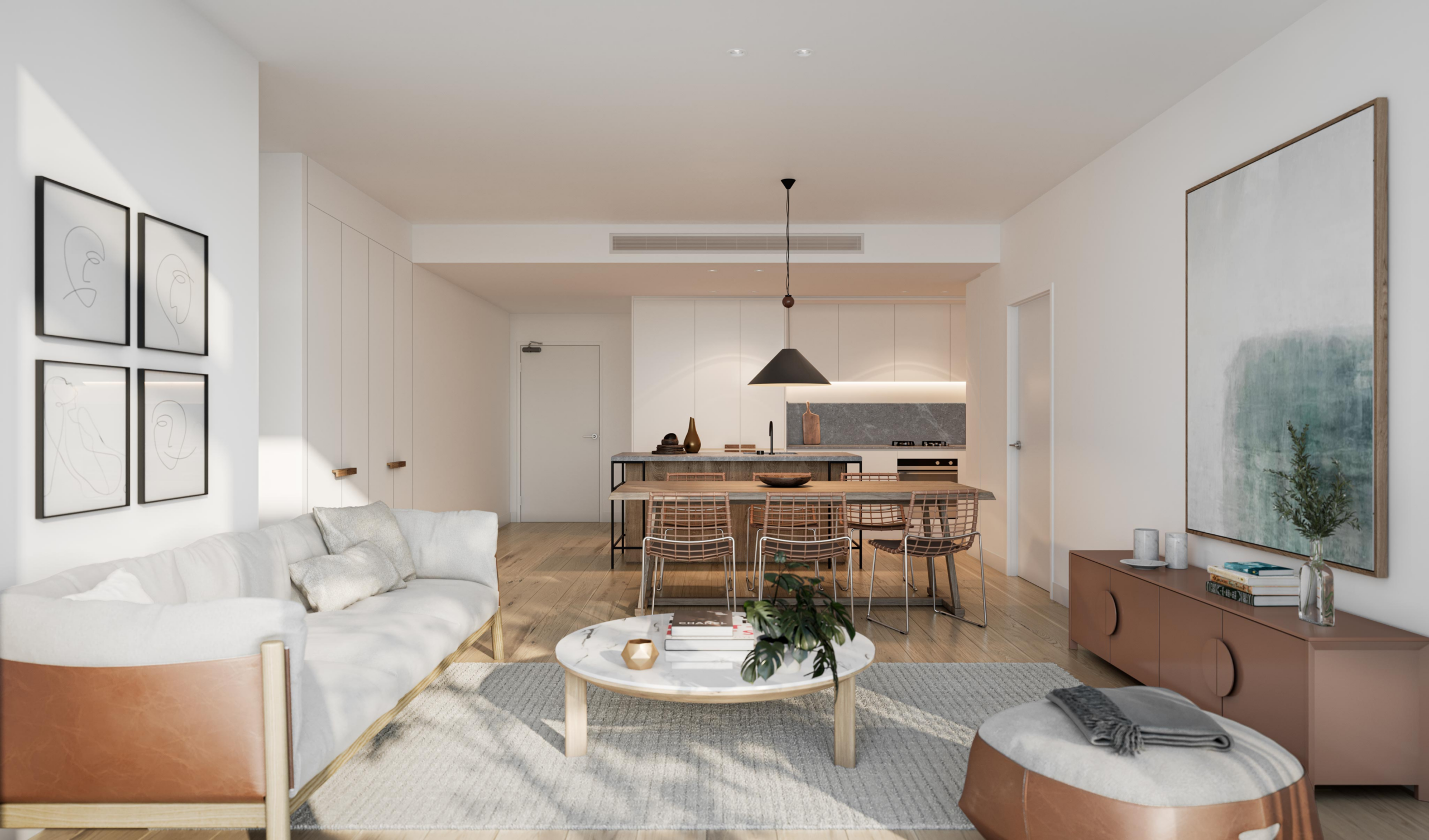 Designed to the highest specifications the layout, interiors and quality, these stunning two bedroom apartments in Marrickville feature timber flooring throughout, natural stone island bench and integrated Fisher & Paykel refrigerator as a standard inclusion.
